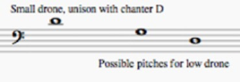 The second, and more detailed of the two examples can be found in the Golden Harpsichord of Michele Todini, displayed at the Metropolitan Museum of Art in New York City¹⁵, and shown on the back cover. This magnificent musical machine includes a sculpture of the cyclops Polyphemus (unrequited lover of Galatea in Ovid’s Metamorphoses), with his “pipes made of a hundred reeds” described by Ovid¹⁶ updated from a bucolic panpipe to a sordellina. This instrument has four pipes: two chanters of equal length, a drone the same length as the chanters, and a long pipe which doubles back on itself. This looks nearly identical to the regulator shown in later depictions of the sordellina, but no keys are present. One could argue that they were left off for ease of carving, but given the level of detail present in the rest of the sculpture (down to the inlet hole in the bellows, details of turning on the chanters and drones, and even the fringe around the neck of the bag and the folds of leather in the bellows), I think it is reasonable to assume that if keys were present, the artist would likely have shown them. That said, it is certainly possible that the complicated keywork of the sordellina could have been omitted for artistic or practical reasons. As in Paoli’s painting, the drone of equal length with the chanter must sound D, in unison with the lowest note of the lower chanter. The low drone (assuming that the sculpture accurately depicts a drone, rather than a regulator with keys omitted) could either sound an octave below that D, or perhaps G a fifth below the chanter D. Given that the music in Baldano’s manuscript shows a strong preference for G, a G drone would be a useful choice. Possible drone pitches are shown in figure 15.